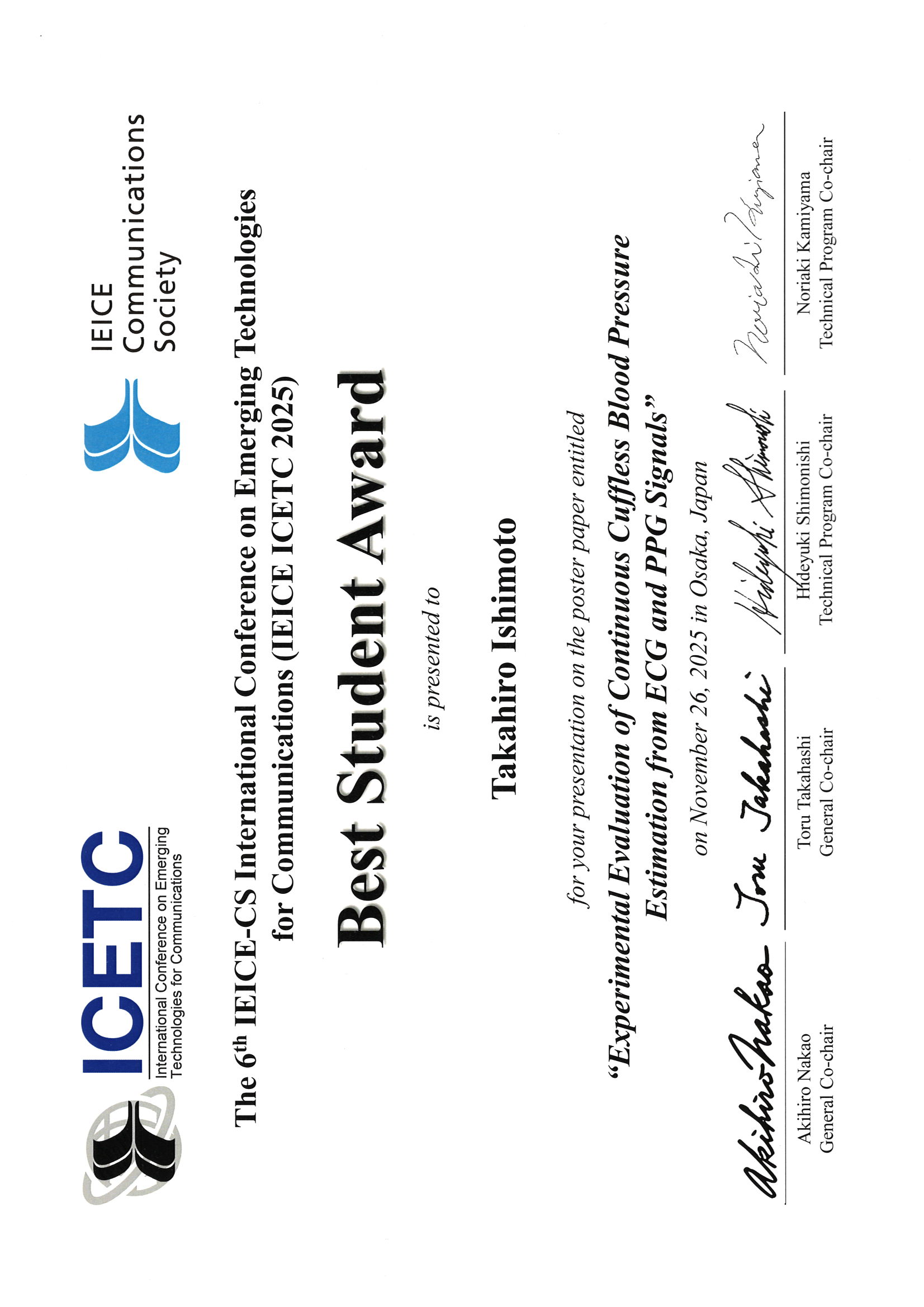 Takahiro Ishimoto: presentation on the poster,"Experimental Evaluation of Continuous Cuffless Blood Pressure Estimation from ECG and PPG Signals," The 6th IEICE-CS Int'l Conf. on Emerging Tech. for Communs. (ICETC2025), P1-11, Nov. 26, 2025.
