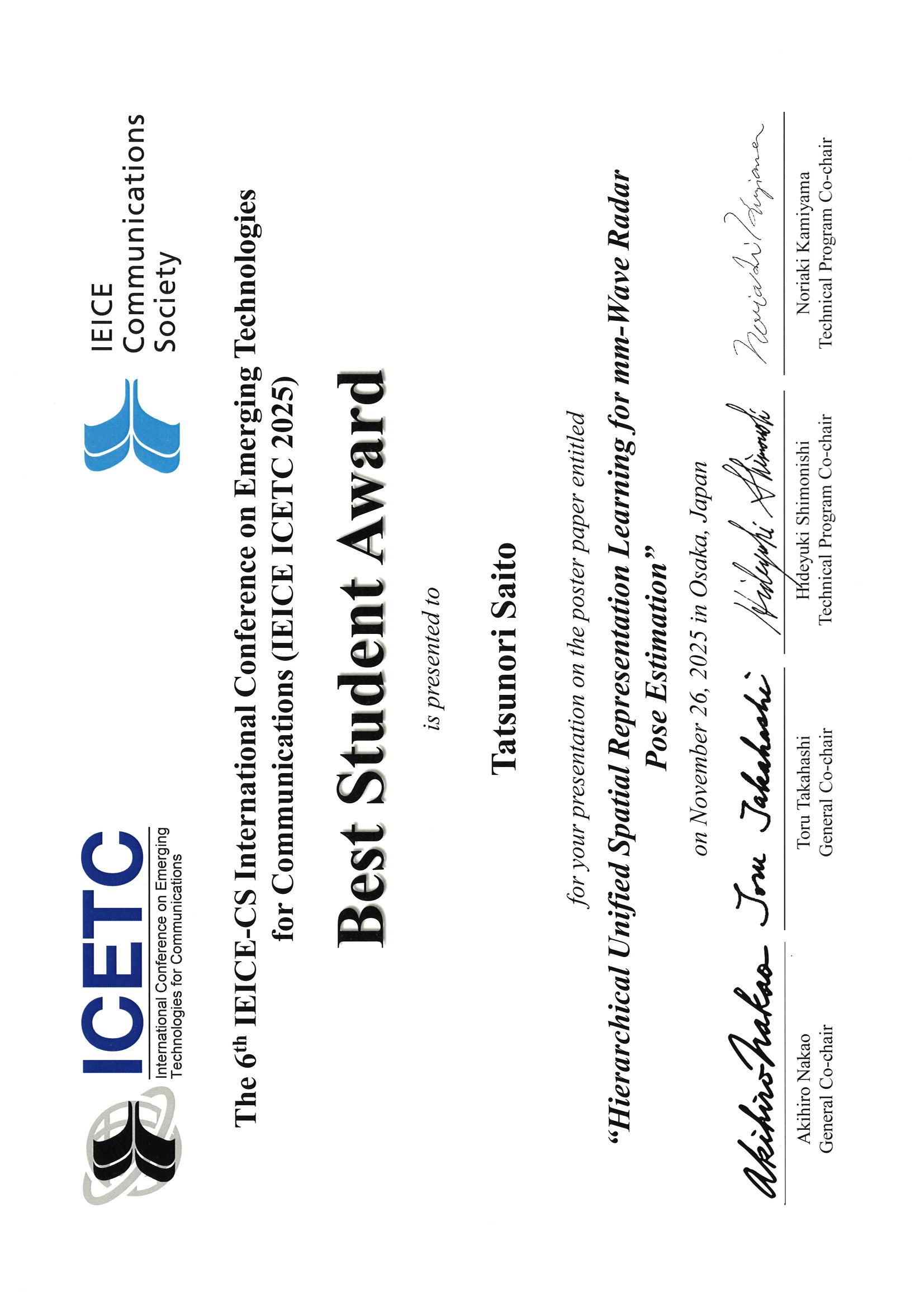 Tatsunori Saito: presentation on the poster,"Hierarchical Unified Spatial Representation Learning for mm-Wave Radar Pose Estimation," The 6th IEICE-CS Int'l Conf. on Emerging Tech. for Communs. (ICETC2025), P1-13, Nov. 26, 2025.